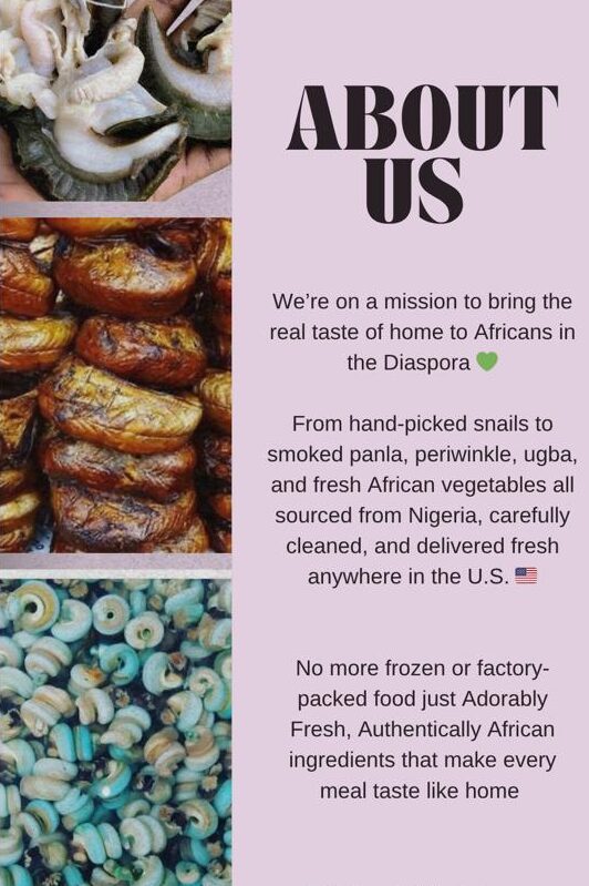 Our products include fresh snails (hand-picked, hand-washed, and ready to cook), naturally smoked Panla) fish, fresh Periwinkle, Oil Bean (Ugba), and carefully selected African vegetables. Every item is sourced directly from trusted farmers and suppliers in Africa, processed with care, and packaged to maintain freshness and authenticity.